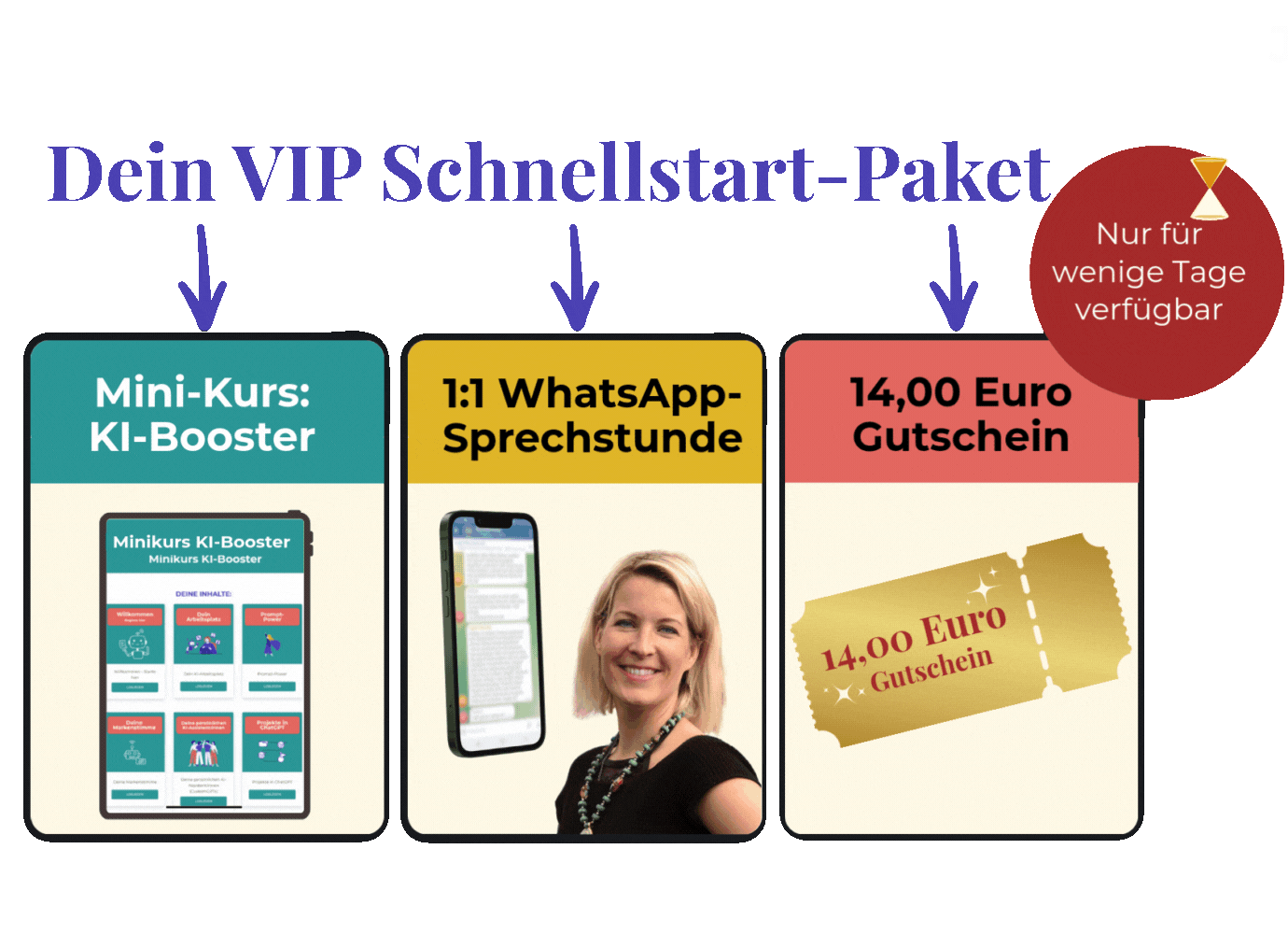 Mit dem VIP Schnellstart-Paket bekommst du exklusive Inhalte & persönliche Begleitung, die dafür sorgen, dass du nicht wieder im Ideen-Chaos landest, sondern wirklich umsetzt.